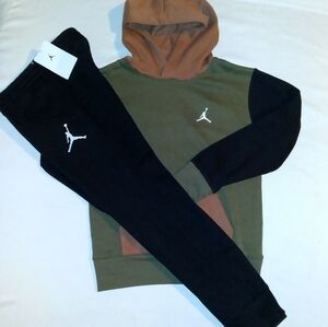 New never worn with tags. Nike set includes a grey heather with white trim long sleeve cotton blend Tee with "Nike" inscription on front. Bottoms are light aqua polyester and cotton blend design with black white trim and elastic waistline with 2 side hem pockets and Nike check logo on left leg with elastic waistline and banded leg opening. Set fits 4 Toddler boys. Any questions, please contact me. Thanks!