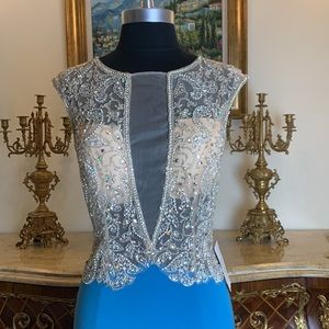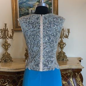 Handmade rhinestone bodice Illusion fitted style spandex fabric teal color