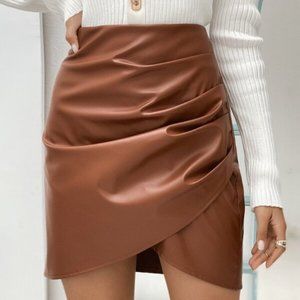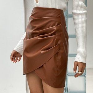 Chic Ruched Tulip Hem Vegan Leather Mini Skirt Zipper camel color