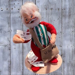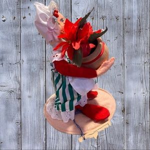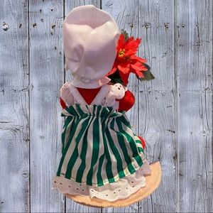 Bring in the holiday cheer with this Vintage 1993 Annalee doll. Mrs Claus is holding a wooden potted poinsettia and wearing a green striped apron and white cap. Fully posable. Original tag still attached. Proudly made in New Hampshire, USA. Sits on a wired round base. Coordinating Santa also available.