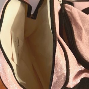 This bag has two zippered pockets in the front of this bag. The bag two side zippered pockets. This come with strap and is gorgeous sparkling pink glitter that doesn't come off bag.
