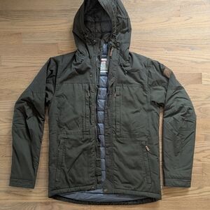 Very good condition full-zip hooded sweatshirt from Lululemon. Original care tag attached. Cotton/Elastane. Color is dark grey/heathered black. Men's Small.