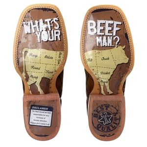 These boots feature a 11" shaft, double stitch welt, breathable leather lining, leather insoles, roper style block heel, square toe and the clear/obvious soles capture a picture of a cow and names of popular beef cuts. The non-marking outsoles also say "What's Your Beef Man?" These Tin Haul cowboy boots have a daring design with soles that are sure to leave an impression.
