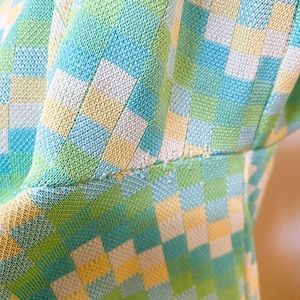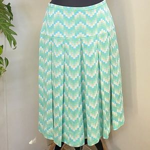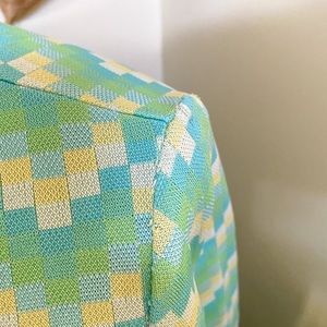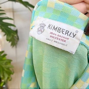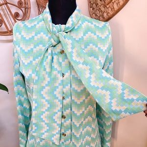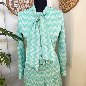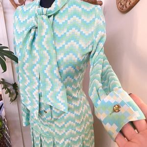 2 piece pleated skirt and bow set made by Kimberly. Funky geometric pattern of yellow, green, and blues. Top has large attached bow collar, gold metal buttons up the front and on the cuffs. Skirt is pleated only on the front. 100% Dacron Polyester so fabric does have some stretch to it. Very good condition for its age but does show some signs of ware around some of the seams as pictured but no holes. Marked size 14 but see measurements for modern day sizing.