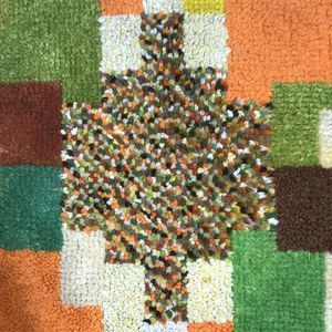 Measuring 45 inches by 45 inches, this funky rug / wall hanging is vintage 1960s and hand crafted. It’s a shag type rug with colors of orange, green, yellow, and brown. I don’t see any missing areas or flaws other than age. I believe it’s probably a latch hook rug! Love the funky whimsical geometric design.