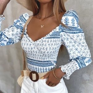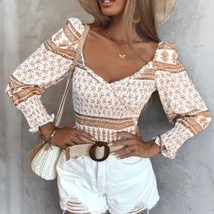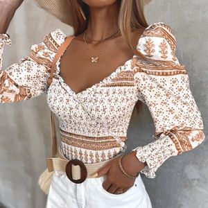 Boho Camel Tan Floral Puff Long Sleeve Crop Top