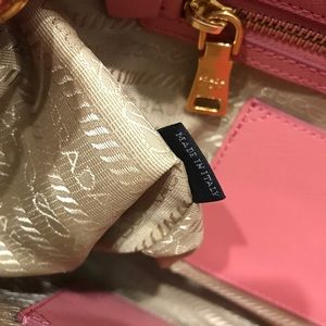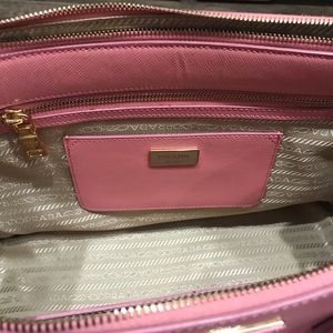 Authentic large Prada Saffiano Lux bag in excellent used condition. Salmon pink color. Structure still good. Clean handles, interior, and exterior. No rips / scuffs on corners & edges. Handles impeccable as I used tilly to protect.