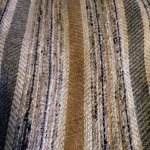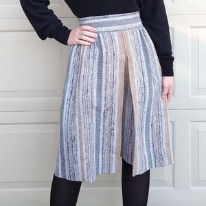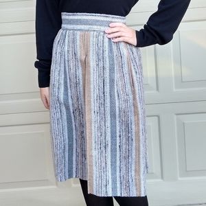 High waisted midi skirt, true vintage, handmade in the 1970's. Gray and tan tweedy stripes, with a little shot of black, and a few flecks of rust. Back metal zip closure. Front center inverted pleat. 27" waist, and it's 27" long. Excellent condition, just got back from the drycleaners.