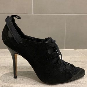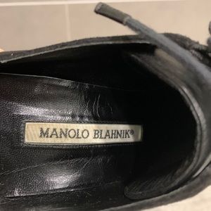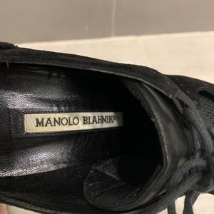 CONSIGNED TO TRR. Manolo Blahnik Heels, size 38. Black suede, mesh overlay of leather mid foot to toe point, lace up closure. Sophisticated and edgy. Very good condition, worn twice. Undersides are darkened and water marked from walking outdoors on sidewalks and a pathway. Includes dustbag, no longer have original box but will ship in MB box (see photo) from different shoes. Approx in inches: 4.25 heel, 3 vamp.