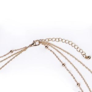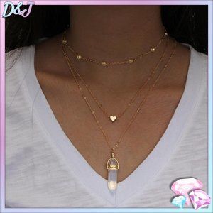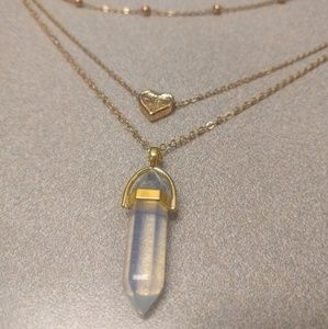 Beautiful gold tone triple layer necklace with a short choker layer, cute heart, and crystal shaped pendant. Available in an opal color and clear purple/lavender color. Cute and decorative necklace perfect for the summer.