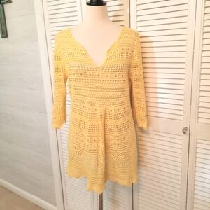 beautiful butter color top from grace elements. 3/4 scalloped sleeve, half v-neck, and pleated waist. cotton blend crochet. size is large. armpit to Armpit is 19", waist is 18", shoulder to hem is 29". like new condition