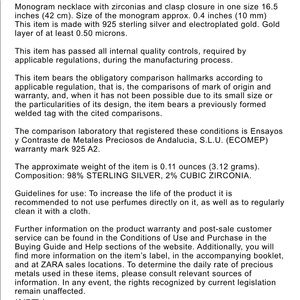 Monogram necklace with zirconias and clasp closure in one size 16.5 inches (42 cm). Size of the monogram approx. 0.4 inches (10 mm) This item is made with 925 sterling silver and electroplated gold. Gold layer of at least 0.50 microns.