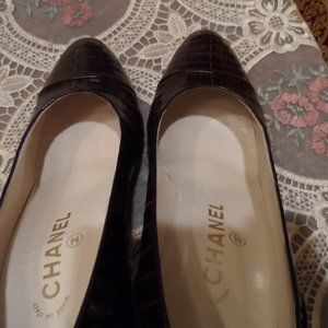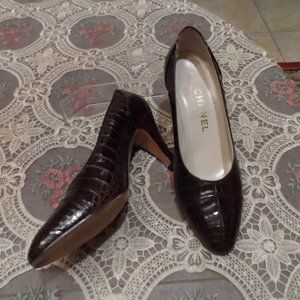 Chanel's classic pumps are pretty hard to beat. This is a real classic. This popular pair has been made in Italy from crocodile leather and has a pointed toe. The brown- hue means they'll go with so much. This shoes are vintage, they are in excellent condition. The ownner which is my friend, bought them at Neiman Marcus in NY City. Size 7.5M. they come in the original box with the dust bag. Measures: 9 7/8 inches in length from the insole and 3 inches wide. The heel measures 3 inches in Height. Chanel recomends to go 1/2 size when buying their pumps. No rips or stains. Comes from a smoke free home. Thank you for your consideration and interest.