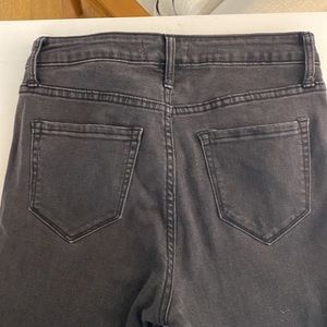 Faded black wash, stretchy and soft, button fly, high rise, raw hem.