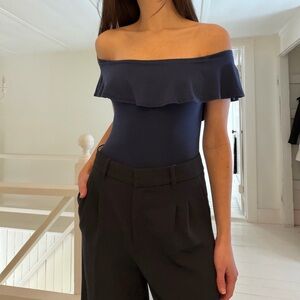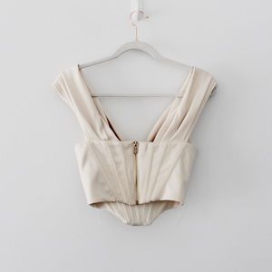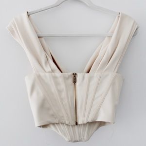 House of CB short sleeve, cropped, ‘Silva’ ivory satin draped shoulder corset top. Heavyweight satin construction. Draped shoulder detailing. Balconette cut. Structured, internal boning system. Pointed, v shape front hem. Fully lined with a stretch woven fabric. Fastens at the back with an exposed zip closure. Excellent condition.