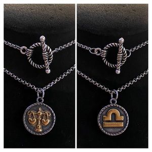 βοΈLIBRA zodiac sign wrap around reversable necklace . Double layer necklace wrap around with two tone gold & silver LIBRA zodiac sign medal coin . Chain is long 34 inch ( meant to be wrap around neck twice ) Two tone silver & gold color medal is also stainless steel ( do not change color & no allergies / nickel free )Antique silver plated Toggle clasp can be worn in front or on the back as you prefer ( If you need a diff size chain lmk ( Handmade by me π ) ( Has different design of LIBRA zodiac on both sides and it is reversable ) Tags: Air signs / Earth signs / water signs / Fire signs / Gemini , Libra , Aquarius , Taurus , Virgo , Capricorn , Cancer , Pieces , Scorpio , Aries , Leo , Sagittarius . Astrology , Astronomy , Astrological , Astronomical , Tarot , palmistry , Gothic , goth , empath , psychic , gypsy / bohemian / bohochic / boho / fortune teller , magic spell / divination / witch / witchy / pentagram / pagan / mystical / palm reader / crystal ball / moon / sun / celestial / moon phase / crecent moon / moon child / full moon / stars / galaxy / galaxies / nebulae / planets / shooting stars / comets / ouija / spirits / tarot cards / witchcraft / angel / oracle / Astrolabe / altar / gems / crystals / healing stones / unicorn / mermaid / black cats / Stylish, dainty , trendy / fairy / hippy / festival / choker / cute / friendship necklace / birthstones / universe / solar system / rocker / rock & roll / biker / celt / celtic / sky / night