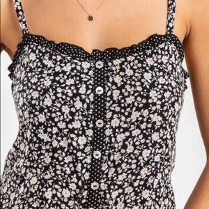 Floral and subtle polka dot print, ruffled and adjustable straps.