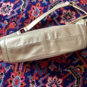 Cache gold shoulder bag with gold hardware and tassel on zipper. Fully lined, rich color. 1 open storage pocket, 1 cell phone pocket and a zipper pocket on other side.