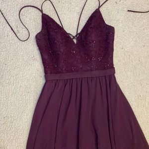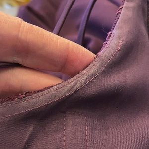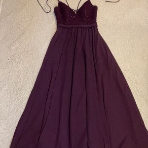 Mori Lee Madeline Gardner Bridesmaid Dress. Size 4. Eggplant. Style 146. Spaghetti strap with a beaded bodice. Deep V neck and a long chiffon skirt. Back zipper. Ribbon waist. Good preloved condition with some discoloration in lining and underarm areas (photos 9 and 10) 100% poly.