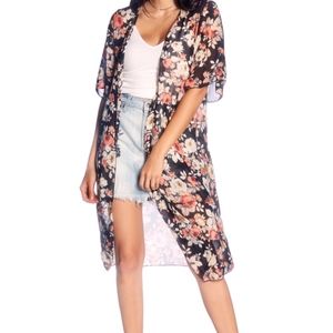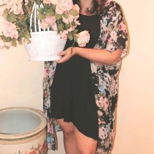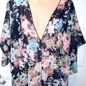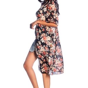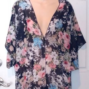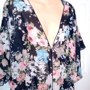 This VIBE Kimono Jacket style Top features a vibrant floral print on a black background. Easy, comfortable style.