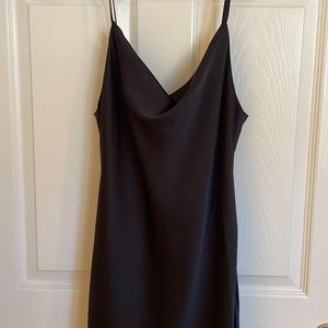 Super stunning satin- look, black, mini dress! Cut in a slip-like silhouette with a draping cowl neck and adjustable spaghetti straps. Invisible back zipper and clasp 💓 never worn I bought it thinking I’d eventually have something to wear it to but never have.