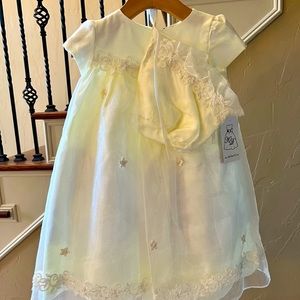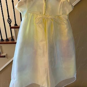 Beautiful embellished and lined girls dress with pearl flowers throughout. Dress includes baby bonnet. Available in white or antique white colors.