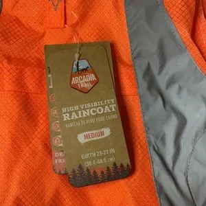 High visibility raincoat by Arcadia Trail. New with tags. Various sizes. Comes with carryall bag and carabiner clip.