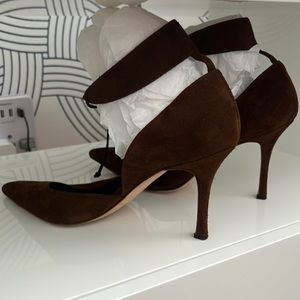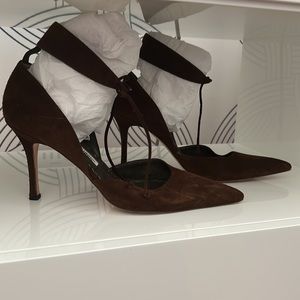 Dark brown suede Manolo Blanik ankle tie heels in size 38 1/2.