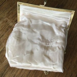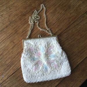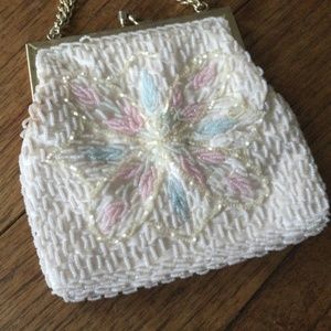 Beautiful vintage hand made beaded evening purse. Made in Hong Kong. Slight stain on upper corner see last photo. Pastel pinks and blues and white sparkly beads on either satin or silk material. Inside is pink silk or satin with small pocket see photos for details inside has no stains or odors. Gold hardware. See photos for measurements.
