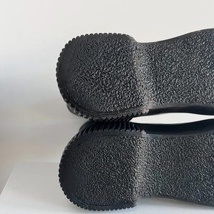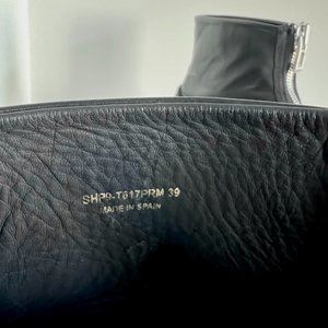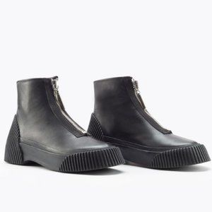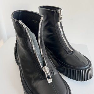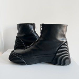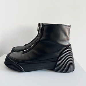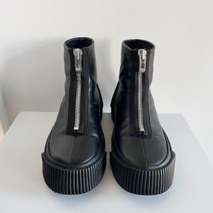 Black leather ankle boots by 3.1 Phillip Lim. Lugged platform soles, exposed zipper at vamp, rounded toe, ridged rubber heel cap. 100% cow leather. Made in Spain.