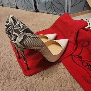Basically Brand New!! I only wore these in my home! I put sole protectors on them as soon as I got them~so they still have the original RED BOTTOMS!! I can take the protectors off if you'd like before shipping (the black spot on the protector is something I stepped on, on my porch. I will try and clean it off before shipping)..They are ☆GORGEOUS☆ white patent leather with snakeskin on the heels! I haven't seen these around a lot! The style is So Kate & "Rocca" is the design name...Comes with the dust bag's and original box! And if I can find the extra protectors, I'll include them as well ♡♡