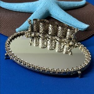 Vintage scissors ✂️ designed crystal rhinestones hinged fashion bangle bracelet. No missing stones. Front is in EVC, back goldtone slightly faded and has some bubbles. When open, the end of closure part need to be clicked (it’s not actually clicking. Just that vibe, if not, it’s loose and moving) see the last 2 pics. For small wrists. My wrist is 6.5” and kinda too tight. Tarnishing to metal.