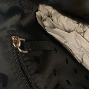 Gold hardware. Pocket in front. Zipped interior pocket. Side interior pockets for phone, etc.