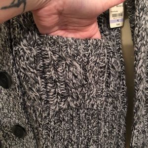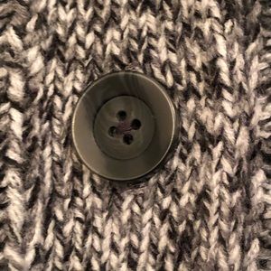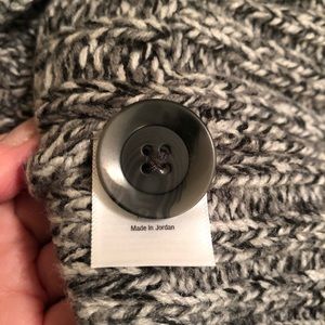 Details: Two front pockets; thicker cable/ribbed fabric; cowl like folded collar; extra button still attached