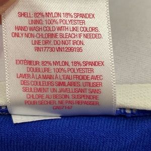 FEATURES: royal blue. white built in padding. ruffled detail. has the holes for a removable strap to be connected, but no strap is included. shell: 82% nylon, 18% spandex. lining: 100% polyester.