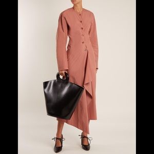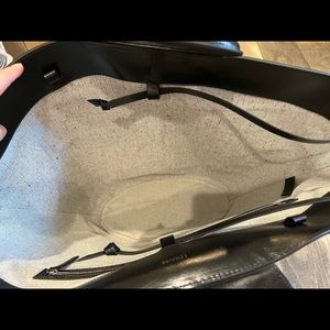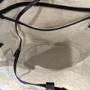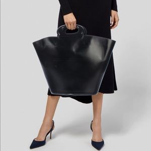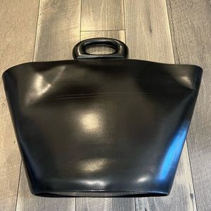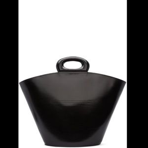 Black leather Lemaire Basket bag with silver-tone hardware, dual rolled top handles, natural canvas lining, single zip pocket at interior wall and tie closure at top.