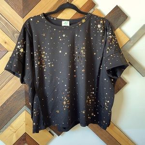 This oversized top is so fun! Made of heavier fabric, so it drapes perfectly. It features shiny copper/gold stars and cut out back.