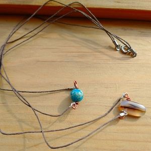 Montana Moss and Blue Imperial Jasper pendants on brown hemp cord that is approximately 18 inches in length for first tier and 22 inches for second and secured with a lobster clasp. Penny used for reference of size.