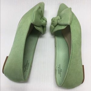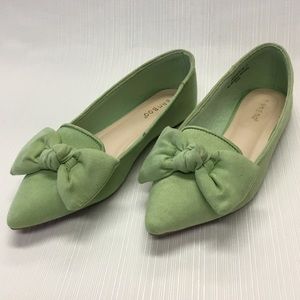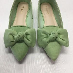 I Ship Fast. Exciting Soft Green Flats with Bows. Padded Footbed. All Man Made. Size 7M USA. Hardly Worn. Very Good Condition.