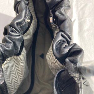 Color: Black faux leather. Gold plated details. Outside zippered pocket.