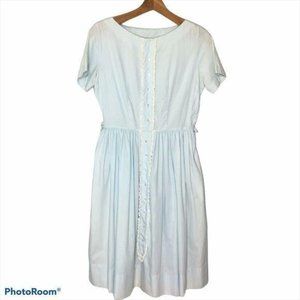 Vintage 1980s green day dress with matching belt. Dropped shoulder dolman sleeves with easy snip shoulder pads. Decorative shoulder epaulets and button front bodice with two functional pockets at chest. Elastic waist with original belt (some minor flaws with belt.) Faux zipper and two pockets.