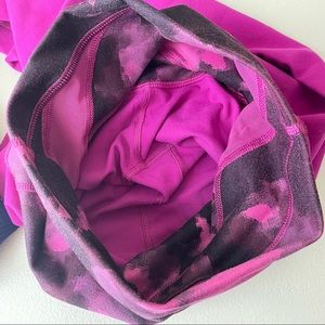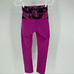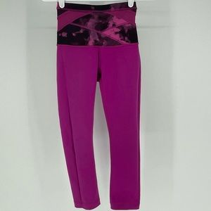 Lululemon Wunder Under Crop Leggings Hi Rise Full on Luon in Raspberry / Blooming Pixie Raspberry Black. Size 2. In good pre-owned condition, light signs of wear. Reversible. One side has the waistband logo and one has logo on the leg. High rise. Waistband pocket on one side. Style #WC4S.