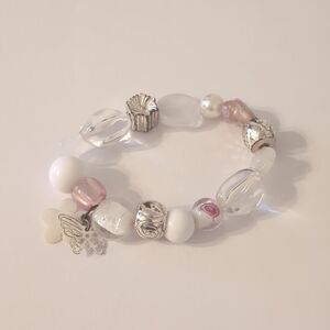 Pink Floral White and Clear Glass Beaded Charm Bracelet with Mother of Pearl Flower and Silver Butterfly