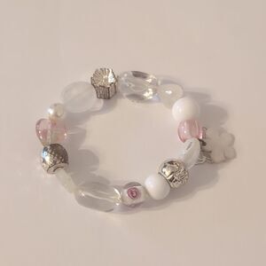 622 Pink White and Clear Glass Beaded Charm Bracelet with Mother of Pearl Flower