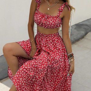 Red Ditsy Floral Print Cami Top & maxi Skirt Set