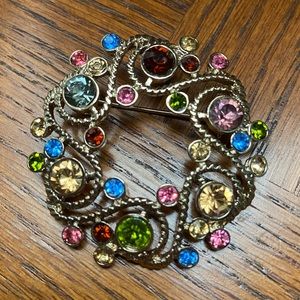 Vintage Antique Wreath Brooch Gold Tone Multi Colored Rhinestones in Great Condition
