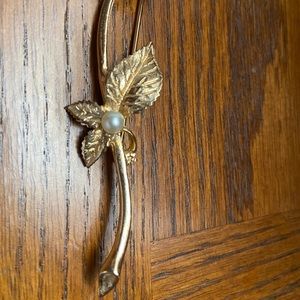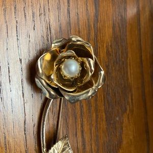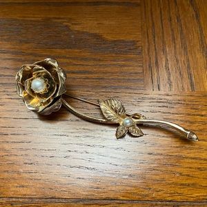 Vintage 50’s Single Rose 🌹 Stemmed Brooch Gold Tone With Plastic Pearl Normal Wear In Good Condition