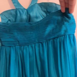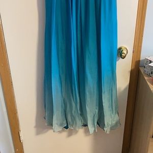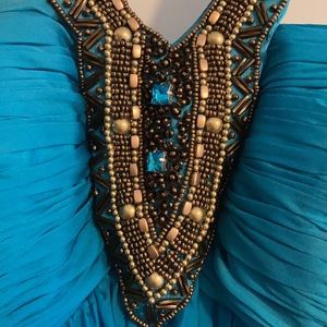 Beautiful teal ombré with brown and bronze beaded neckline. (Also saves the work of finding a necklace to wear 😉). Fully lined with built in padding! Length from armpit to hem is about 48 inches