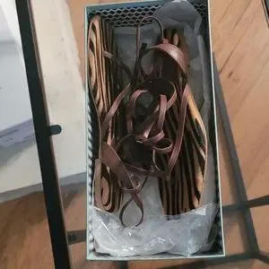 New in box thong sandals are gorgeous with zebra print and gladiator type strapes. Leather with pony hair soles. Size 5. The last photo is of a current listing of a shoe by same designer to show current trend and price. Never worn