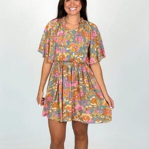 💋SOLD💋Women’s Green Floral Butterfly Sleeve Elastic Waist Dress Size Medium